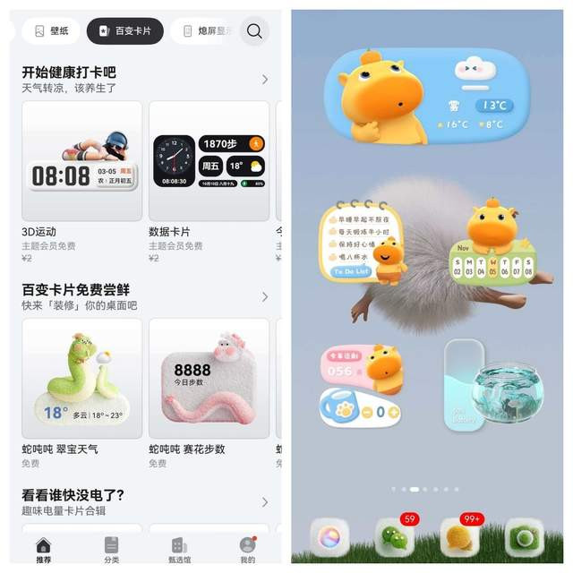 而且我发现拥有了华为主题会员之后,不仅能换上各种互动性极强的主题,还可以为桌面添加“百变卡片”,为平平无奇的手机桌面进行精装修,比如我就将几个可爱的天气、日历、喝水打卡等卡片自定义大小后放在了桌面上,感觉立刻不一样了!