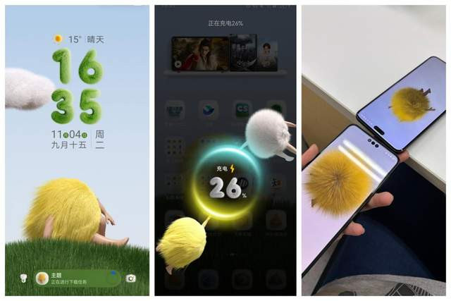 而且这个主题里“小惊喜”一个接一个,在锁屏上双击空白处,能切换趴着的小毛球;插上充电器,专属动画就跳了出来:两只小毛球一起围着充电图标发电;两台同样主题的手机轻轻一碰,屏幕上的两个小毛球居然“biu”地一下,一起“炸毛”了,有时还会解锁一个超酷的碰撞动画,手机瞬间有了生命。这些藏在细节里的互动,让我这个“实用主义者”也忍不住会心一笑。